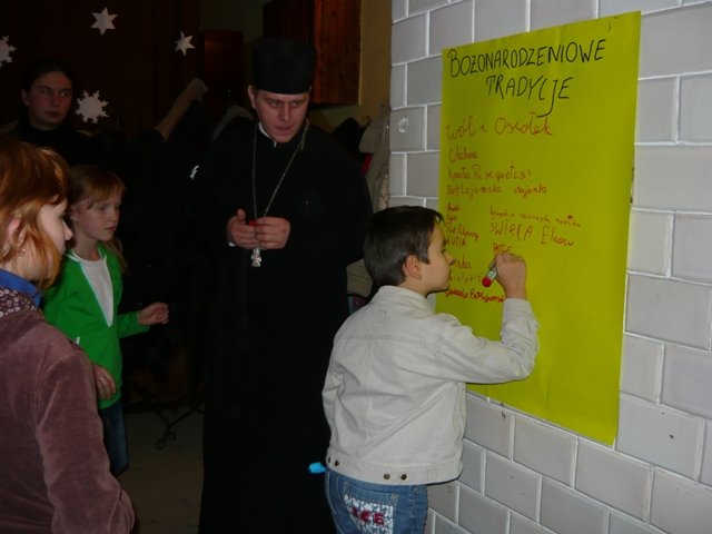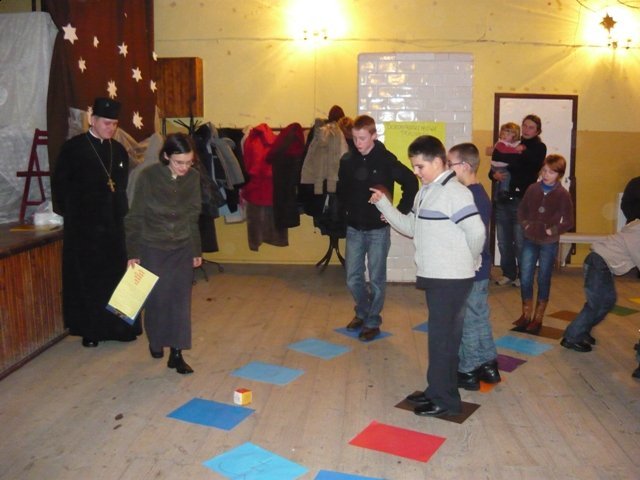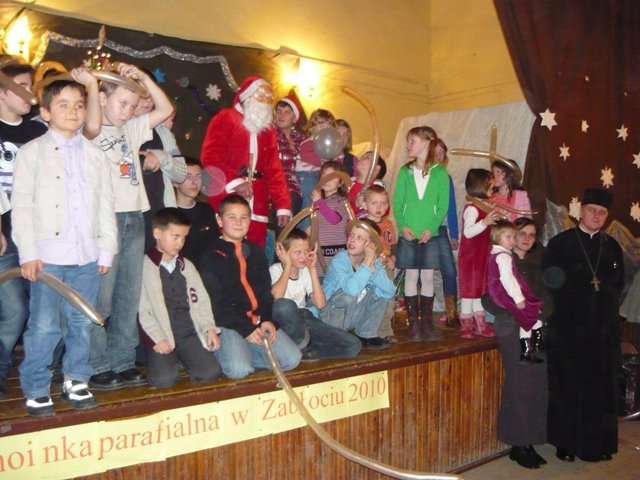 17 stycznia Dom Kultury w Zabłociu napełnił się gwarem rozentuzjazmowanych dzieci, zapachem świerku i domowego ciasta. Punktualnie o godzinie 15.00 wspólnie zaśpiewana kolęda „Oj na mory, mory…” rozpoczęła drugą część choinki zorganizowanej przez parafię prawosławną pw. św. Mikołaja w Zabłociu. Wcześniej wszyscy bowiem spotkali się w cerkwi na Świętej Liturgii. Po wspólnym zaśpiewaniu kolędy, proboszcz ks. Tomasz Wołosik, serdecznie przywitał przybyłych gości: dzieci, ich rodziców, dziadków, a nawet pradziadków. Dziadkowie z wielkim entuzjazmem i zapartym tchem oglądali popisy artystyczne swoich wnuków oraz dopingowali ich w licznych konkursach. Dzieci musiały się wykazać wiedzą z zakresu tradycji bożonarodzeniowych w grze planszowej, która z Zabłocia przez Górę Synaj, rzekę Jordan wiodła do stajenki betlejemskiej. Następnie z Jeziora Galilejskiego trzeba było wyłowić wszystkie rybki, w brzuszkach których ukryte były niespodzianki. Były również baloniki, wewnątrz których były zapisane bożonarodzeniowe tradycje i zwyczaje. Po teologicznym łamaniu głowy nadszedł czas na rozprostowanie kości w konkurencjach sportowych. Ostatnią i najważniejszą konkurencją był zabłocki przegląd kolęd, uczestnicy którego otrzymali pamiątkowe dyplomy i czekoladowe statuetki. Po konkursach odbyła się minidyskoteka, którą przerwało wtargnięcie z workiem prezentów na plecach wujka Arka, który kolejny już raz przebrał się za mikołaja. Dzieci ochoczo siadały mu na kolanach, szeptały do ucha wierszyki bądź nuciły kolędy, a mikołaj bezbłędnie pamiętał, kto w tamtym roku grał mu na flecie kolędy, kto zaśpiewał kolędę, a kto obiecał to uczynić w tym roku. Znalazł się także urwis, który chciał oderwać mikołajowi brodę. Jednak zapobiegliwy mikołaj przykleił sobie dwie. Radość w oczach i na buziach małych urwisów sprawiła, że w niepamięć poszły wszystkie psoty, a mikołaj obiecał również za rok zajechać do Zabłocia.