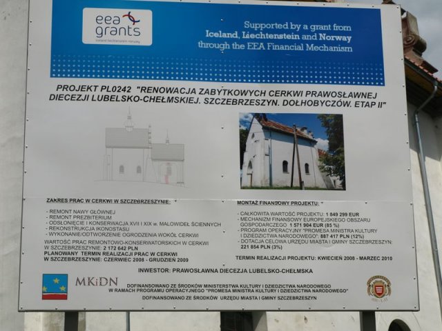 Miło nam poinformować, że z dnia na dzień coraz bardziej widoczne jest zaawansowanie prac remontowych w cerkwiach w Szczebrzeszynie i Dołhobyczowie. Przypomnijmy że, remonty obu tych świątyń realizowane są w ramach projektu „Renowacja zabytkowych cerkwi Prawosławnej Diecezji Lubelsko – Chełmskiej. Szczebrzeszyn. Dołhobyczów. Etap II”. Projekt finansowany jest ze środków Mechanizmu Finansowego Europejskiego Obszaru Gospodarczego, Programu Operacyjnego Promesa Ministra Kultury i Dziedzictwa Narodowego oraz dotacji Urzędu Miasta i Gminy Szczebrzeszyn. Realizacja projektu rozpoczęła się z dniem 1 kwietnia 2008r. W miesiącach kwiecień – lipiec m.in. wyłoniono wykonawców: • prac remontowo budowlanych na obiektach w Dołhobyczowie i Szczebrzeszynie; • prac konserwatorskich w zakresie odsłonięcia i konserwacji malowideł ściennych cerkwi w Szczebrzeszynie oraz konserwacji polichromii cerkwi w Dołhobyczowie, a także prac konserwatorskich polegających na rekonstrukcji ikonostasu w Szczebrzeszynie i Dołhobyczowie, • nadzoru inwestorskiego, z którymi zawarto stosowne umowy. Prace remontowo – budowlane na obiektach rozpoczęły się z początkiem lipca 2008 r. Do chwili obecnej dokonano dwóch częściowych odbiorów prac. Na dzień 30 września br. planowany jest kolejny odbiór. W cerkwi w Szczebrzeszynie wykonano: • izolację pionową i poziomą, • krzyżowe zszywanie murów. W cerkwi w Dołhobyczowie wykonano: • izolację i naprawy ścian fundamentowych, • instalację elektryczną (WZL i tablice rozdzielcze, zamontowano gniazda wtykowe, oświetlenie), • instalację elektryczną zasilającą podgrzewacze promiennikowe, • instalację odgromową, • posadzki (bez okładzin), • tynki wewnętrzna kopuły dzwonnicy, • stolarkę okienną. Miło nam również poinformować, iż Ministerstwo Kultury i Dziedzictwa Narodowego i Ministerstwo Rozwoju Regionalnego pozytywnie zatwierdziły sprawozdanie kwartalne z realizacji projektu. Do 20 sierpnia br. Prawosławna Diecezja Lubelsko – Chełmska złożyła pierwszy wniosek o płatność za okres od kwietnia do lipca 2008r. Projekt realizowany jest w partnerstwie z Norweskim Instytutem Kultury. Prawosławna Diecezja Lubelsko-Chełmska Biuro ds. Projektów