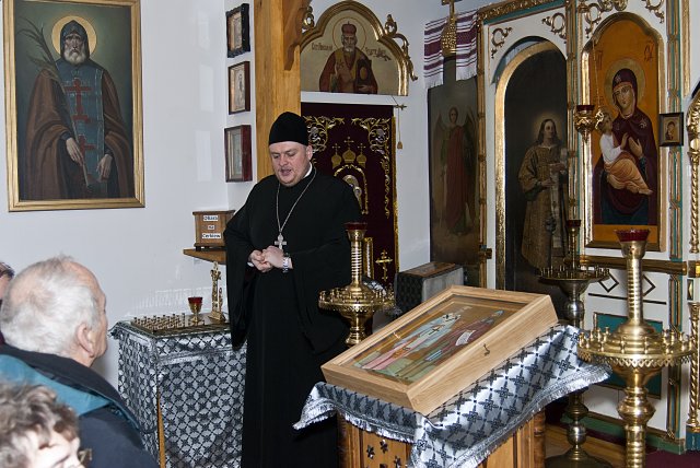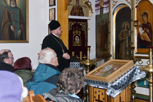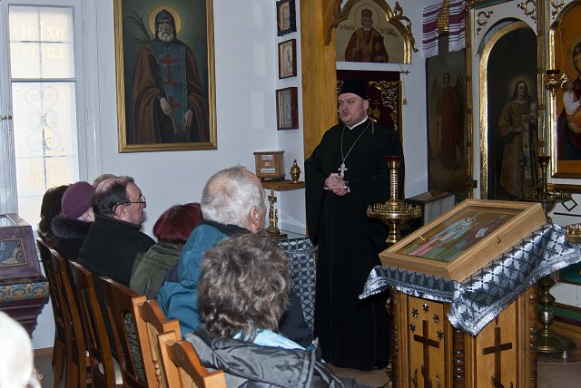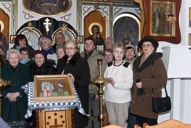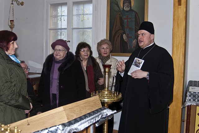 Dnia 4 marca br., z błogosławieństwa abp Abla, w Parafii Prawosławnej pw. św. św. Równych Apostołom Braci Cyryla i Metodego w Sandomierzu, miało miejsce spotkanie członków Sandomierskiego Uniwersytetu Trzeciego Wieku przy Wyższej Szkole Humanistyczno – Przyrodniczej w Sandomierzu. Tematem przewodnim było zagadnienie: Różnice i wspólne aspekty wyznań, prawosławnego i rzymsko – katolickiego. Prelekcja została zorganizowana na prośbę pani Mieczysławy Stec, starościny SUTW, mieszkającej niedaleko parafii.   Na początku spotkania, prelegent ks. Marcin Chyl odniósł się do przedmiotowego hasła spotkania, ukazując podobieństwa i rozbieżności jakie ukształtowały dwa wyznania. Przybliżył wspólną historię pierwszego tysiąclecia ale i rozchodzące się drogi drugiego milenium. Zaakcentował niepożyteczną tendencję rozwoju dogmatu, niekorzystnie wpływającą na perspektywiczną możliwość wspólnego spożywania Ciała i Krwi Chrystusa przy jednym ołtarzu. W drugiej części spotkania uczestnicy skierowali do proboszcza szereg różnorakich pytań związanych z funkcjonowaniem parafii, ilością wiernych, istotą grzechu, postów w prawosławiu, roli kobiety w zbawieniu oraz liturgicznego śpiewu i jego znaczenia dla nabożeństwa.   Na koniec wizyty opiekun naukowy SUTW pani Ewa Cieślak, podarowała duchownemu album ze zdjęciami panoramy Sandomierza i pisemne podziękowanie od wszystkich studentów za ciekawy i interesujący wykład. W odpowiedzi na ten miły gest ksiądz proboszcz rozdał każdemu z obecnych broszurki o historii prawosławia na ziemiach sandomierskich. Słuchacze Sandomierskiego Uniwersytetu Trzeciego Wieku stanowią zwartą grupę, której głównym celem jest zaspokojenie potrzeb i zainteresowań edukacyjnych, rekreacyjnych, twórczych, prozdrowotnych sandomierskich seniorów. Ich cechą charakterystyczną jest ogromna różnorodność osobowości ukształtowana odmiennymi doświadczeniami życiowymi. Jedni spełniają teraz marzenia z młodości, kiedy to z różnych powodów nie mogli studiować. Inni, Ci którzy studia skończyli, uświadamiają sobie, że ich wiedza zestarzała się i chcą ją uzupełnić, wzbogacić by nadążyć za postępem cywilizacyjnym, naukowo-technicznym. Niektórzy pragną znaleźć partnerów do dyskusji lub rozwijać swoje zdolności artystyczne, literackie, a jeszcze inni szukają po prostu przyjaźni, ciepła, oparcia w drugim człowieku. Obecnie na zajęcia SUTW regularnie uczęszcza około 65 osób. Fot. autorka