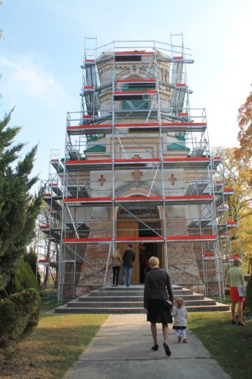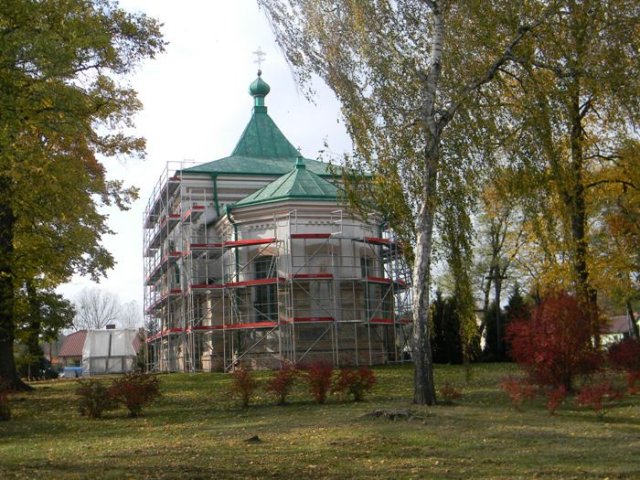 14 października 2014 roku w Kobylanach niedaleko Terespola uroczyście obchodzono święto Opieki Matki Bożej (cs. Pokrow Preswiatoj Bohorodicy). Na tegoroczne święto parafialne przybyli duchowni z dekanatów terespolskiego i bialskiego. Boskiej Liturgii przewodniczył ks. Wincenty Pugacewicz, rezydent parafii śww. Cyryla i Metodego w Białej Podlaskiej. Z homilią do zebranych wiernych zwrócił się ks. Jan Grajko z Kodnia. W swoim słowie przypomniał on historię święta oraz zwrócił uwagę na nieustanną potrzebę uciekania się pod opiekę Najświętszej Bogurodzicy. Na zakończenie nabożeństwa ze słowami podziękowania wystąpił proboszcz parafii w Kobylanach, ks. Michał Ciuchaj. Wyraził on wdzięczność za to, iż mimo trwających prac remontowo-budowlanych kobylańskie uroczystości zgromadziły tak wielu wiernych. W sposób szczególny podziękował duchowieństwu, chórowi pod kierownictwem Natalii Iwaniuk, a także tym wszystkim, którzy potrudzili się przy przygotowaniu remontowanego wnętrza do świątecznego nabożeństwa. Rozpoczęte latem tego roku prace remontowe i konserwatorskie przy cerkwi Opieki Matki Bożej w Kobylanach są częścią projektu „Wschodniosłowiańskie dziedzictwo kulturowe – konserwacja, renowacja, digitalizacja zabytkowych cerkwi” dofinansowanego ze środków Mechanizmu Finansowego Europejskiego Obszaru Gospodarczego 2009-2014 w ramach Programu „Konserwacja i rewitalizacja dziedzictwa kulturowego„. Pokryta od zewnątrz rusztowaniami świątynia świadczy o stałym postępie prowadzonych prac. W ostatnich tygodniach rozpoczęto wymianę poszycia dachowego frontowej dzwonnicy. Ponadto przygotowano zewnętrzną elewację, część ścian wewnątrz cerkwi i posadzkę pod dalsze prace remontowe poprzez usunięcie starych warstw tynku i oczyszczenie zniszczonych miejsc. Proboszcz wraz z parafianami wyraża nadzieję, iż za rok sceneria święta parafialnego będzie zupełnie inna, a zabytkowa cerkiew zaprezentuje pełnię swojego blasku. Fot.: Magdalena Turuta