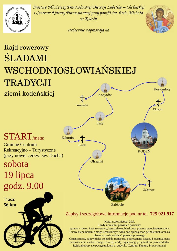 Centrum Kultury Prawosławnej przy parafii św. Archanioła Michała w Kodniu i Bractwo Młodzieży Prawosławnej Diecezji Lubelsko – Chełmskiej serdecznie zapraszają do udziału w rajdzie rowerowym „Śladami wschodniosłowiańskiej tradycji ziemi kodeńskiej”, który odbędzie się w sobotę 19 lipca.