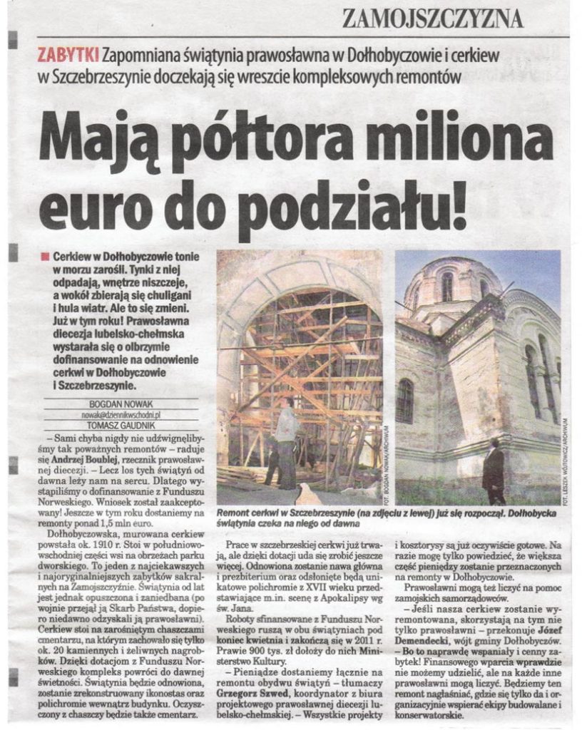 Cerkiew w Dołhobyczowie tonie w morzu zarośli. Tynki z niej odpadają, wnętrze niszczeje, a wokół zbierają się chuligani i hula wiatr. Ale to się zmieni. Już w tym roku! Prawosławna diecezja lubelsko-chełmska wystarała się o olbrzymie dofinansowanie na odnowienie cerkwi w Dołhobyczowie i Szczebrzeszynie.